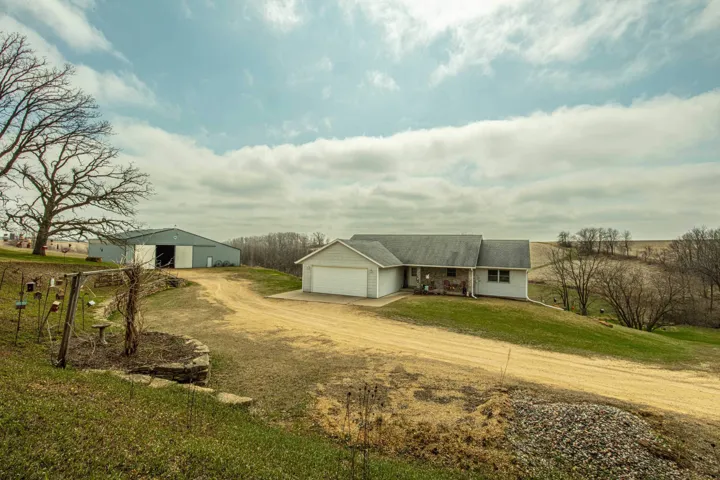 Country paradise on 44+ acres near Dodgeville—ideal for hobby farmers, horse enthusiasts, and hunters. This 5BR/3BA home offers panoramic views, a meandering creek, woods, and tillable acreage teeming with deer and turkey. The main-level primary suite includes a spa-like bath and walk-in closet. Enjoy open-concept living with a fireplace and deck views. The walkout lower level features in-floor heat, rec room, 2BR, and a full bath. Includes a 50×90 Cleary pole building with 18′ lean-to—perfect for horses, equipment, or livestock. A dream setup for a hobby farm, hunting retreat, or equestrian escape in Southwest Wisconsin.