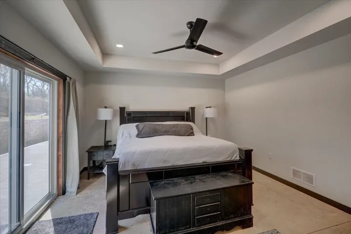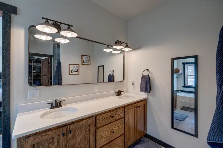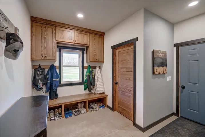 Beautiful custom home in Iowa County nestled on 7+ acres. This 2022 custom built, 3,000sq. ft. home offers a private oasis with country views and modern amenities. Featuring an open-concept ML with vaulted ceilings in the living room, large office, quartz countertops, a large island and hidden spacious pantry in the kitchen. The generous primary suite includes a soaking tub and walkout to the back patio with hot tub, and walk-in closet with laundry. The upper level includes loft area overlooking living space, 4 spacious bedrooms, 2 additional bathrooms and another laundry space. A massive 40’x 55′ garage is attached to the home that includes in floor radiant heat and zoned heating. Don’t miss this rare opportunity for country living just minutes from town.