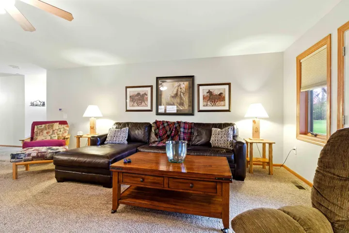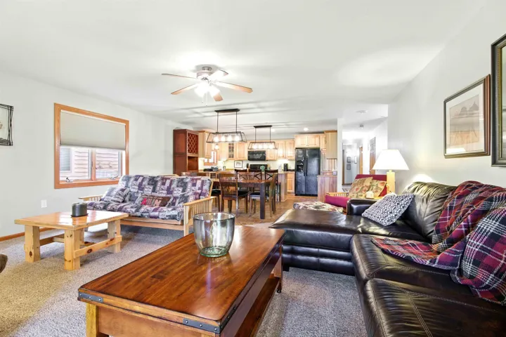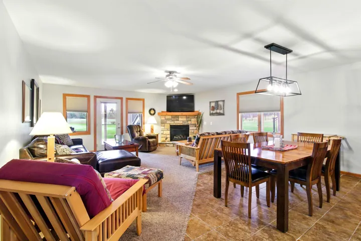 Pride of ownership is evident in this meticulously maintained condo that features a panoramic view of the replica Hole #3. This 3 bedroom, 2 bath features 3 large bedrooms including a master suite, an inviting living room with gas fireplace, a chef pleasing kitchen with ample cabinets and spacious island, a roomy dining area, laundry area, direct access to garage for all your toys. Move-in ready. Amenities-beach, in-ground pool, workout area, playground, tennis, pickleball, basketball courts & more. Relax on the inviting private patio or enjoy the championship golf course or Castle Rock Lake. Affordable Central WI getaway!