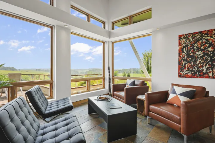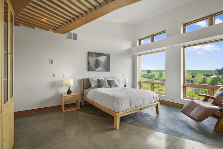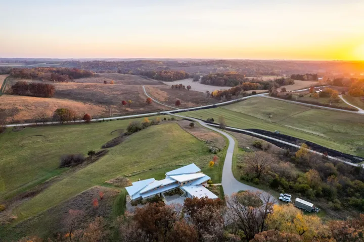 Frank Lloyd Wright meets Frank Gehry in this stunning fusion of midcentury modern and contemporary design. This south-facing, hilltop property is set on 15.5 acres with 3 acres of mature woods and breathtaking Driftless views. This custom masterpiece must be seen to be believed. The expansive Great Room anchors the home, complemented by a chefs kitchen with Subzero/Wolf appliances, quartz countertops, cork floors, and touchless faucets. Built sustainably with Ecoclad siding, SIPs construction, and a Brazilian Ipe deck. Features include whole-house 7-zone audio, Paradigm 5.1 surround sound, passive heating/cooling, 9-zone radiant floors, a 4-ton geothermal system, and Loewen triple-pane window, HVAC costs only $1,500/year. LL beds/baths part. finished. https://8680messerschmidtdrive.com