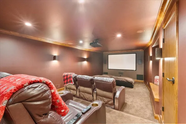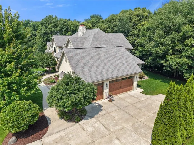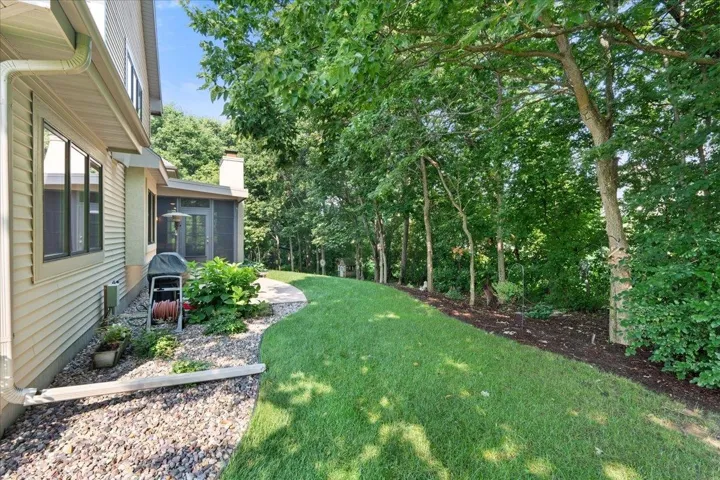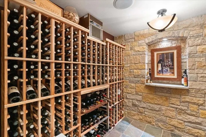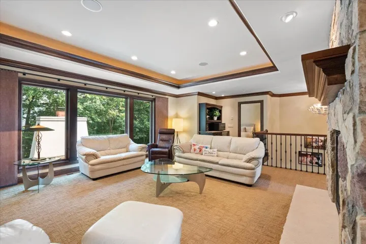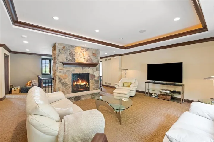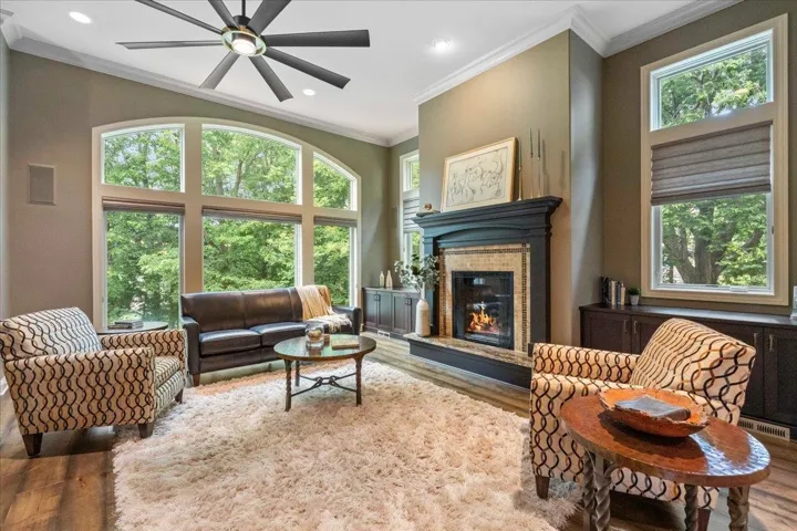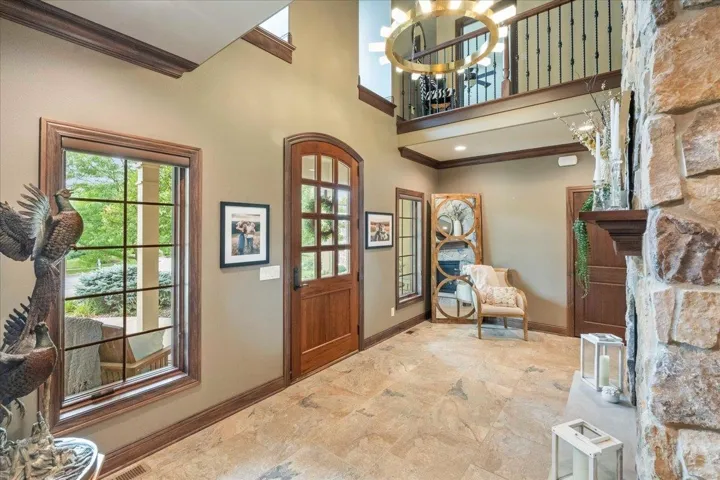 This enchanted storybook executive 2-story Hart DeNoble Parade Home blends timeless charm with elegant craftsmanship. Enter through a dramatic 8ft+ red oak door into a two-story foyer with a stunning floor to ceiling stone fireplace. Enjoy the open-concept living area with a 16-ft sliding glass door to a 3-season room overlooking a private, tree-lined backyard. The designer kitchen features Sub-Zero/Wolf appliances, elegant cabinetry, and a two-tier island. The spacious primary suite includes heated floors, a jetted tub, and curved glass block shower. Upstairs offers a family room with fireplace, 3 bedrooms—Jack & Jill bath and one en-suite. The lower level includes a full bar, theater, wine cellar, 5th bedroom, bath with steam shower/heated floors. Designed for entertaining at every level