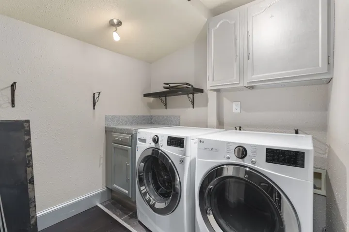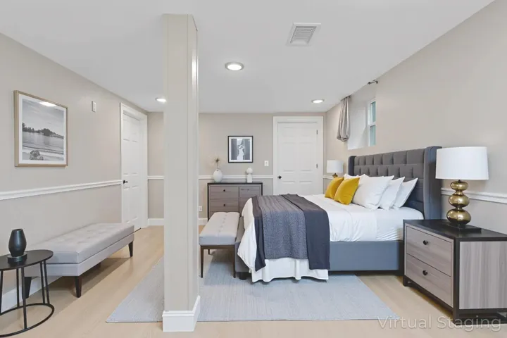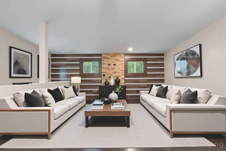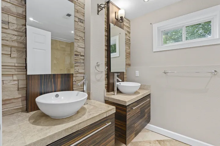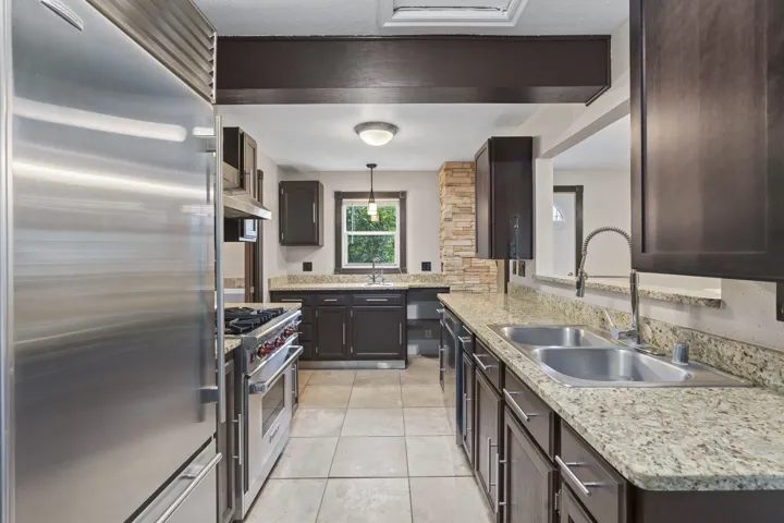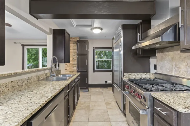 This one-of-a-kind home offers a flexible layout and lush, private setting just steps from the lake. Main level features a bright living area with engineered hardwood floors and a beautiful accent wall including floor to ceiling stone- ready for a fireplace! Kitchen is a home chef’s dream with granite countertops, Sub-Zero fridge, and gas Wolf range. Just off the dining/living space, a deck overlooks the fully fenced yard- perfect for morning coffee or evening unwinding. Full bathroom with walk-in, tiled shower & sizeable laundry room round out the level. Head downstairs to find two comfortable bedrooms and a second full bathroom, creating a quiet and private retreat for sleeping, guests, or working from home. Large, detached two-stall garage provides storage, workspace, or room for toys!