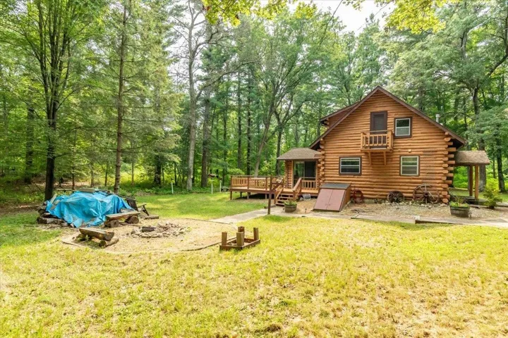 Rustic Log Home on 20 Wooded Acres Near Castle Rock & Petenwell Lakes! Escape to this authentic log retreat nestled on 20 lush, wooded acres just a short drive from both Petenwell and Castle Rock Lake. The home boasts an inviting open concept with a massive wood-burning fireplace and a wood furnace for cozy warmth. Outdoors, enjoy lazy evenings at your firepit sharing stories under the stars—plus a spacious deck perfect for entertaining or quiet reflection. A detached two-car garage offers plenty of storage, while the surrounding forest ensures privacy and tranquility. Ideal for those craving rustic charm, natural beauty, and easy access to premier fishing, boating, UTVing and wildlife viewing. Nearby many championship golf courses. Your serene haven awaits. Call today!