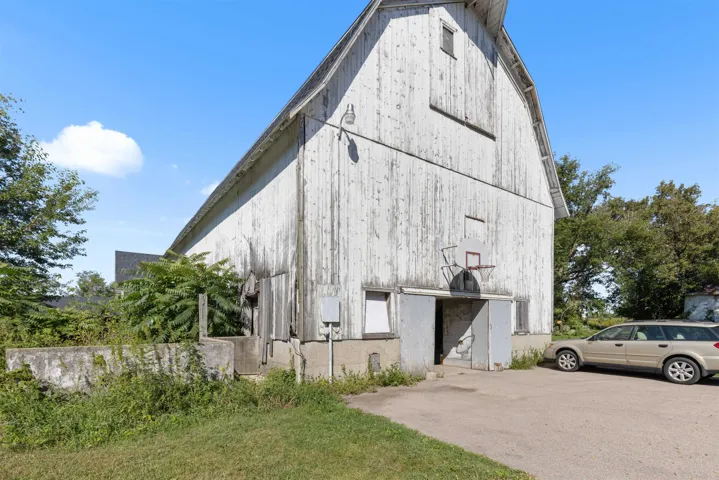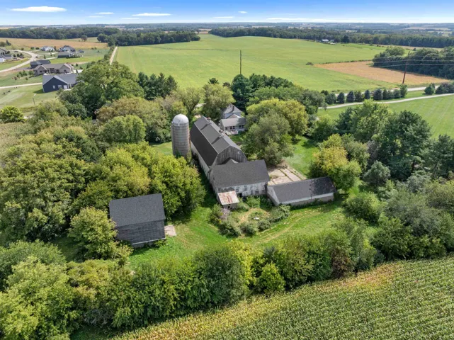 Fabulous opportunity to live in or develop. Farmhouse, guest house, barn outbuildings = 25+acres. Farmhouse boasts wood floors, exposed brick, wood beams, updated kitchen and bathroom, large addition includes family room w/gas fireplace and primary suite with bedroom, bathroom, laundry, and den accessible by stairs or ramp. Guest house (700 sq. ft.) with family room, sitting room, 2 bedrooms, kitchen and bath. 4 car bays behind the 2-story barn(new roof 2023). Add’l buildings: grainery, silos, sheds. Central vacuum in original house, sump pump only in crawl space under addition. Original basement has wood fireplace. Known radon of 5.3, will not be mitigated. Both houses and buildings are AS-IS, no repairs. Farm land lease expires 11/01/25. Farmland Buyer to verify measurements