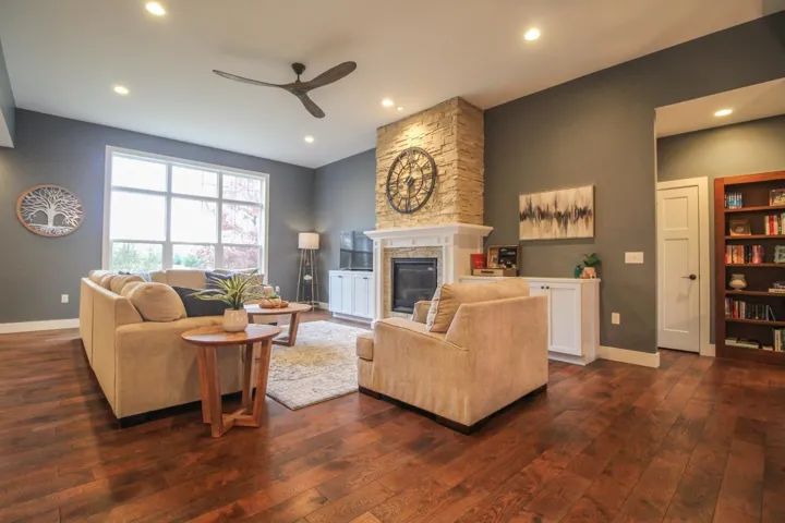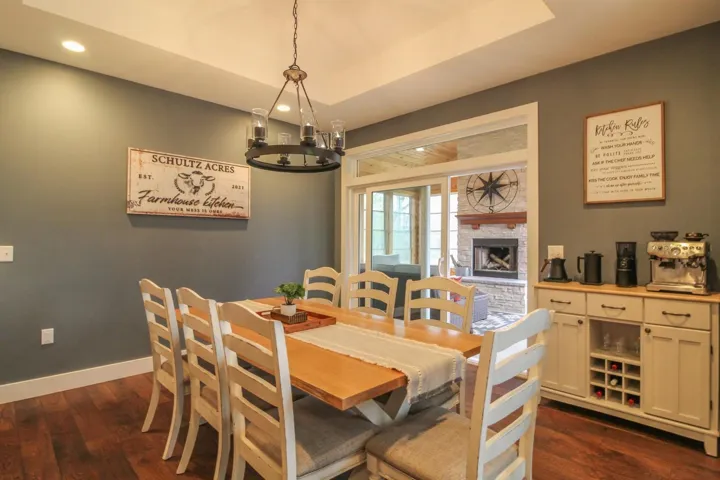Feel the embrace of this exquisite open floor plan; perfect for entertaining. Impressive kitchen w/island, food pantry & spacious dining area that opens to 3-season porch w/woodburning FP. Cozy up to a fire while overlooking private, almost 3-acre sanctuary w/walking trails, access to bike path & short drive to town. Greatroom w/gorgeous FP, built-in cabinetry & a flow of natural light. Split BR layout, luxurious primary en suite w/tiled walk-in shower, office/sitting room & laundry/mudroom with cabinetry & cubbies. Fin exposed LL offers 2 additional BRs, full bath w/steam shower, amazing space for a rec room, theatre room &/or workout area. Added bonus, plumbed for a wetbar! Great storage in unfinished areas & 3-car garage w/stairway access to LL. Live in comfort w/dual zone temp control
